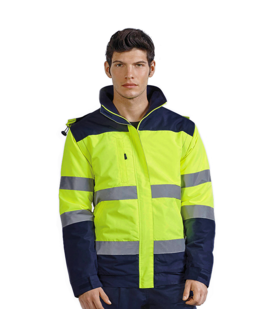 Ανακλαστικό Δίχρωμο Μπουφάν υψηλής ευκρίνειας με ανακλαστικές φάσες σε κορμό και μανίκια. Η σύνθεση του αποτελείται από 100% polyester - 400gr , αδιάβροχο, αντιανεμικό με αποσπώμενα μανίκια. Διαθέτει τσέπη στο στήθος με φερμουάρ, κουκούλα με φλούο rib και ρυθμιζόμενο κορδόνι, κλείσιμο μπροστά με velcro και φερμουαρ, εσωτερική τσέπη στο στήθος και εσωτερικό φερμουαρ. Για τέλεια εφαρμογή και ποιότητα που διαρκεί ακολουθήστε τις οδηγίες πλυσίματος που αναγράφονται στην ειδική ετικέτα. Επικοινωνήστε τηλεφωνικά για περισσότερες πληροφορίες ή/και για παραγγελίες.
